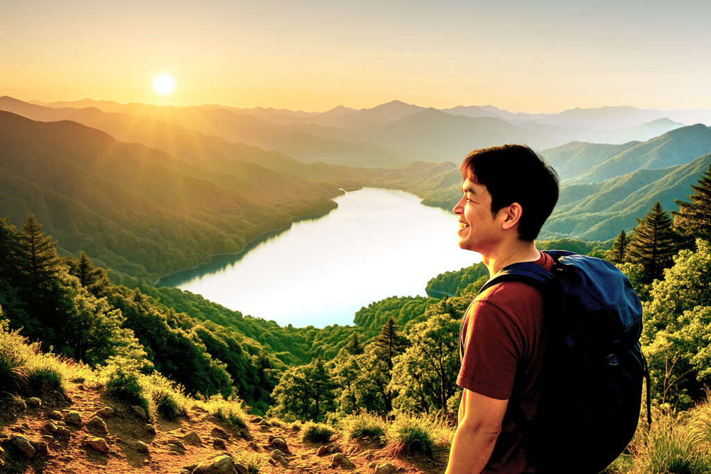 まだ薄暗い中、トレッキングコースの入り口へ向かうと、ひんやりとした空気が身体を包み込みます。ヘッドランプの光に照らされながら、木々の間を進むと、次第に東の空が茜色に染まり始めました。頂上に着くころには朝日が山並みを黄金色に輝かせ、眼下には霧がかった湖面がきらきらと揺れて見えます。目の前に広がる大自然のパノラマをしばし堪能し、深呼吸をすると、心が澄み渡ります。